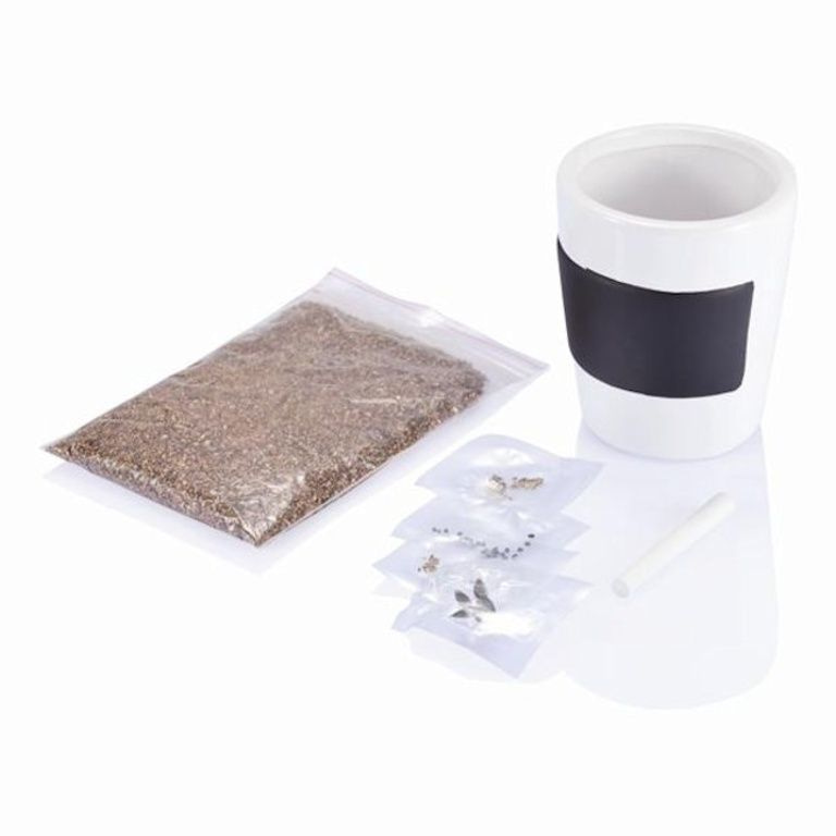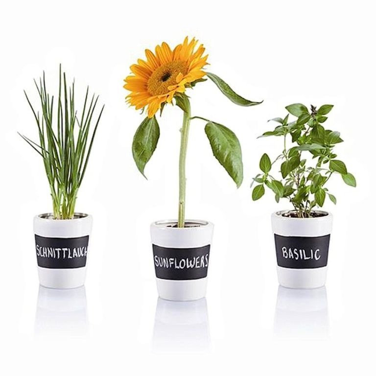 Socraigh de 3 potaí luibh ceirmeach le dromchla gclár dubh. Lena n-áirítear cailc, ithir agus síolta le haghaidh peirsil, síobhais, basil agus lus na gréine síolta.